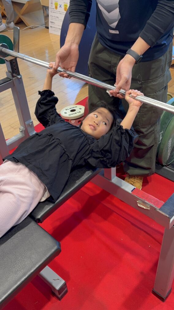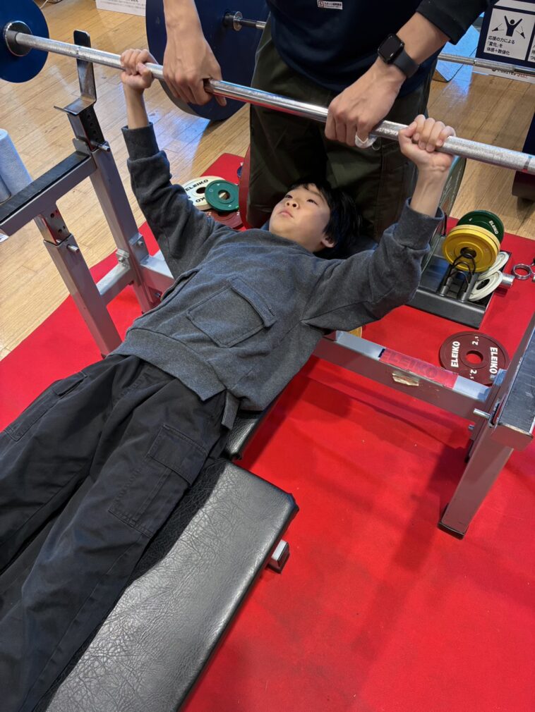 重量上げに挑戦する長男。