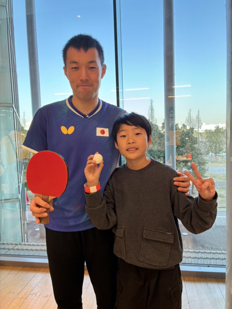 長男は卓球の選手と記念写真!